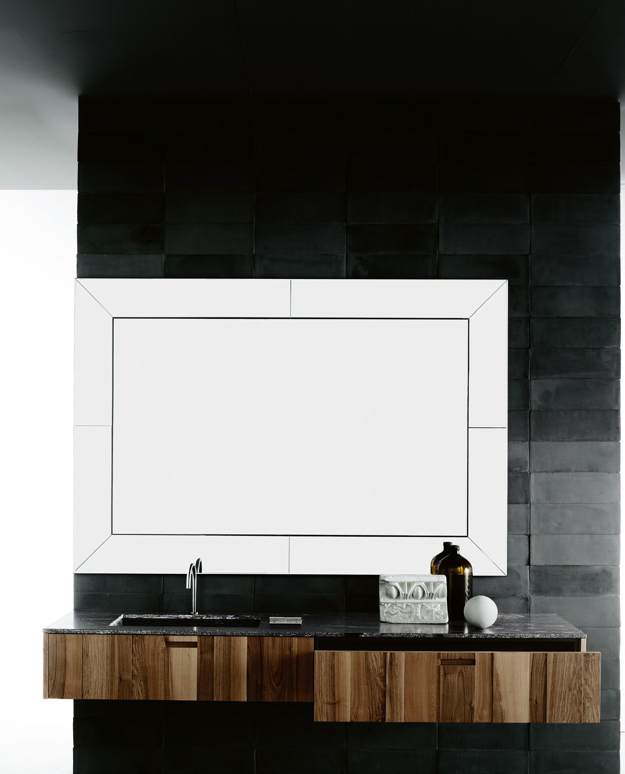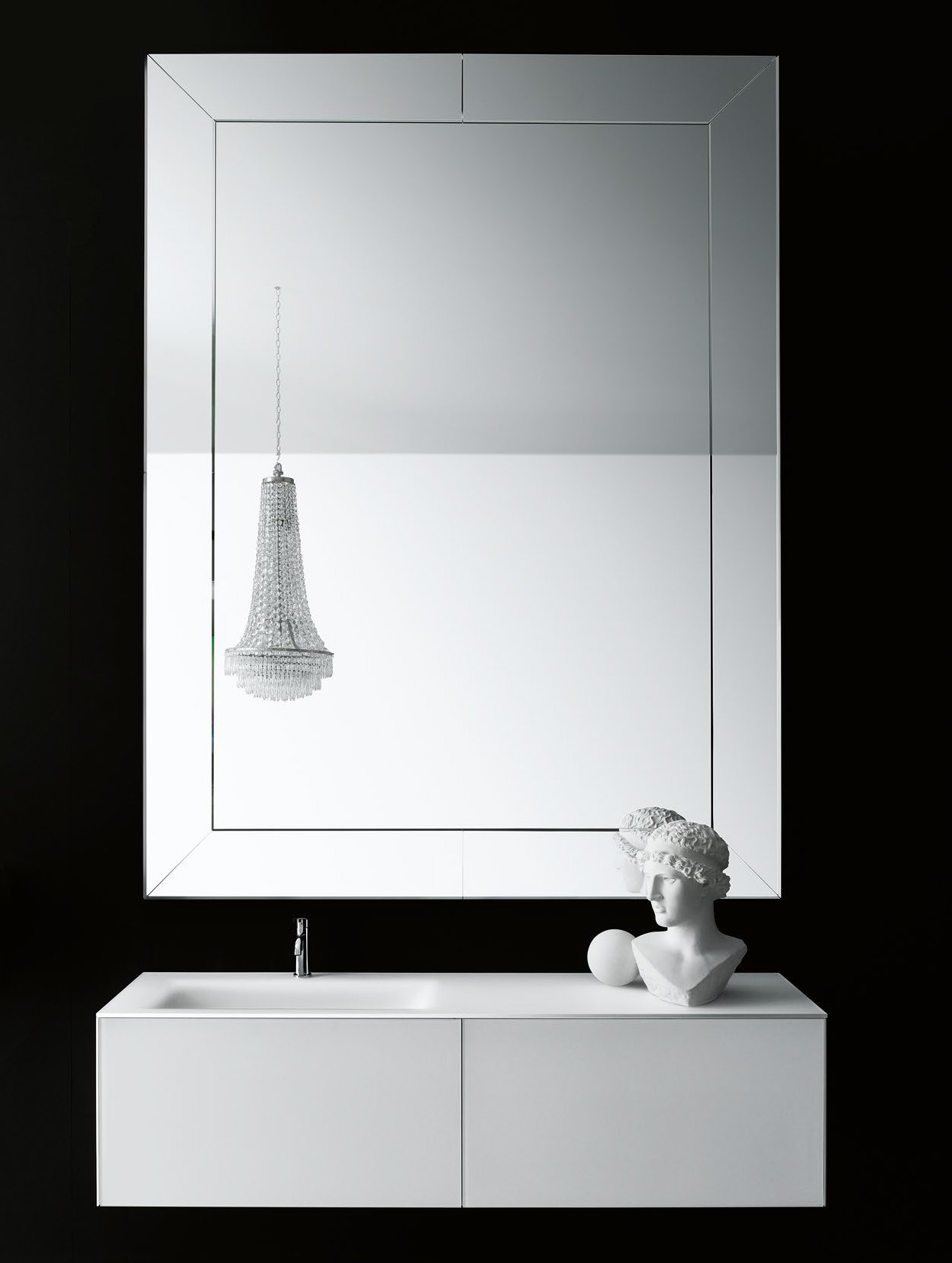 Dieser Spiegel elegante Spiegel von Boffi besitzt einen Aussenrand aus geschliffenem Spiegelglas. Die Spiegelmasse werden den Kundenwünschen angepasst.
