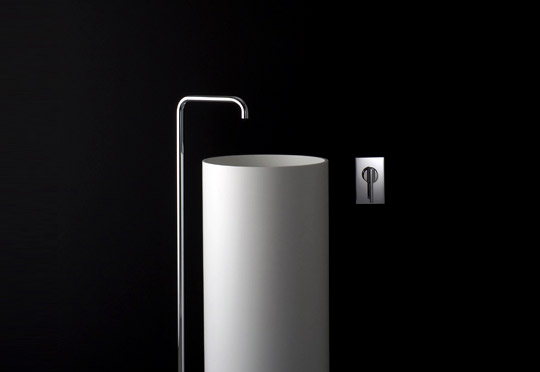 Schlichtes, zylindrisches Standlavabo mit Höhe 90cm in Glas oder Corian. Das Hängelavabo PHW ist mit seiner Höhe von 45cm der kleine Bruder.