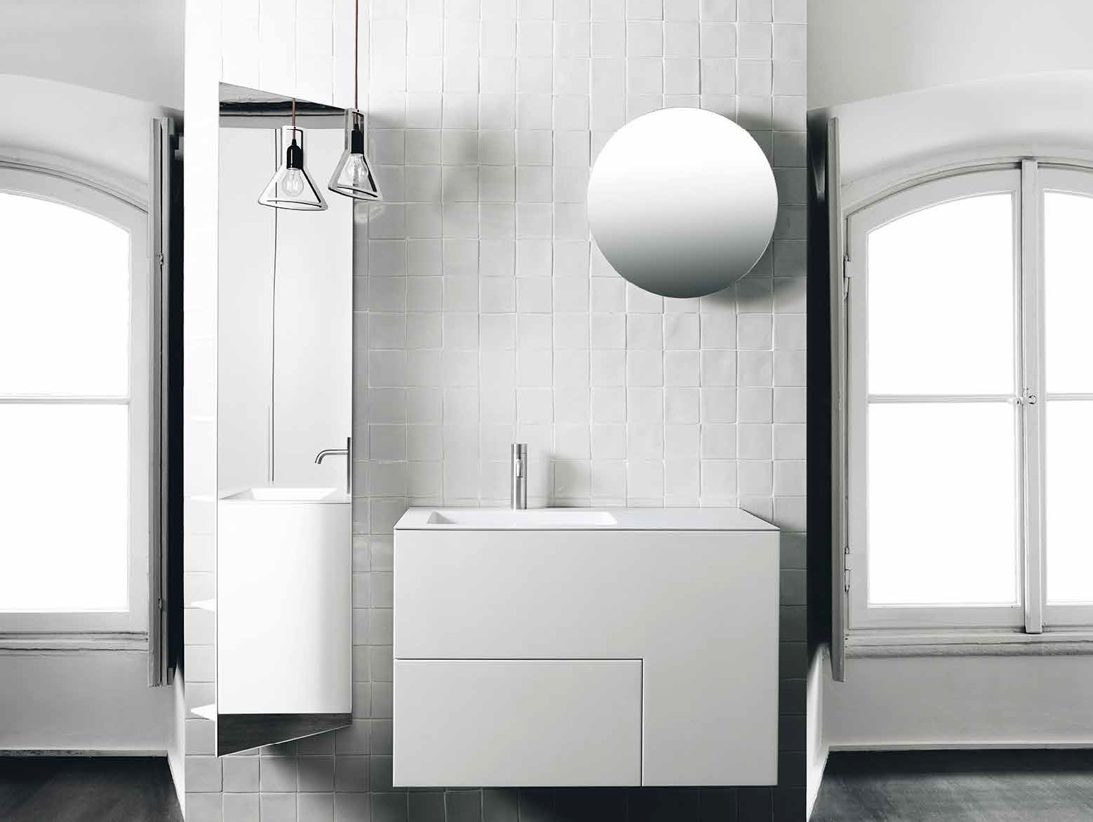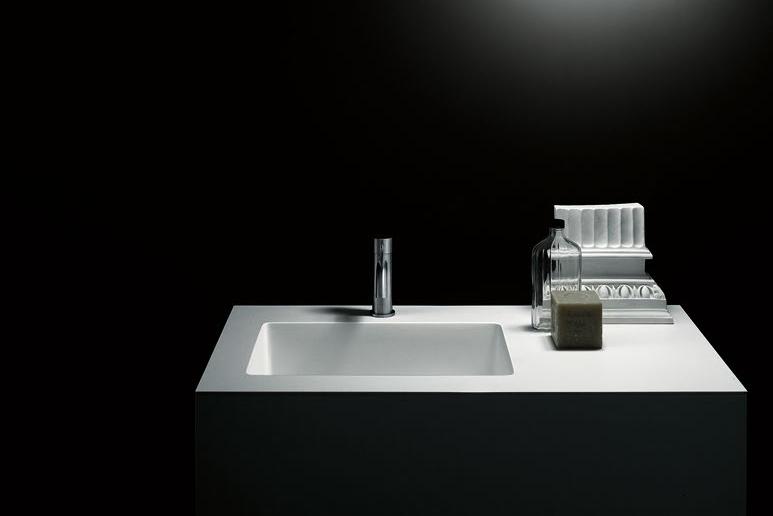 Schlichter Waschkorpus in Cristalplant integriert in einen MDF mattlackierten Kubus mit drei Auszügen.