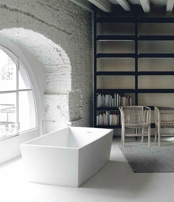 Block shaped bathtub made of matt white Cristalplant®.