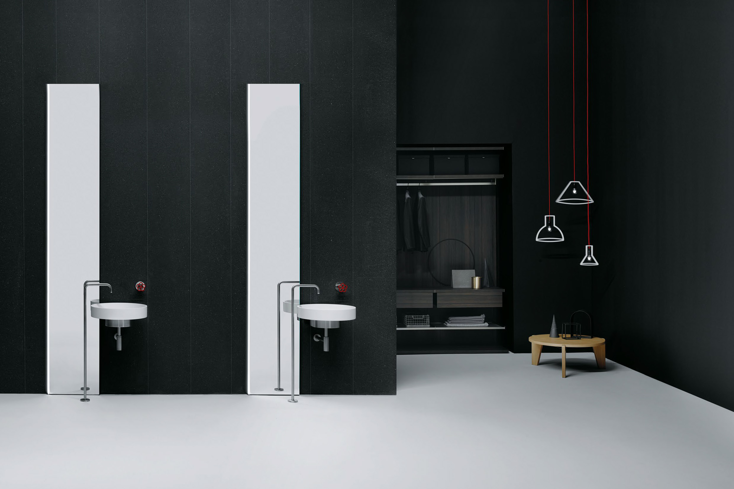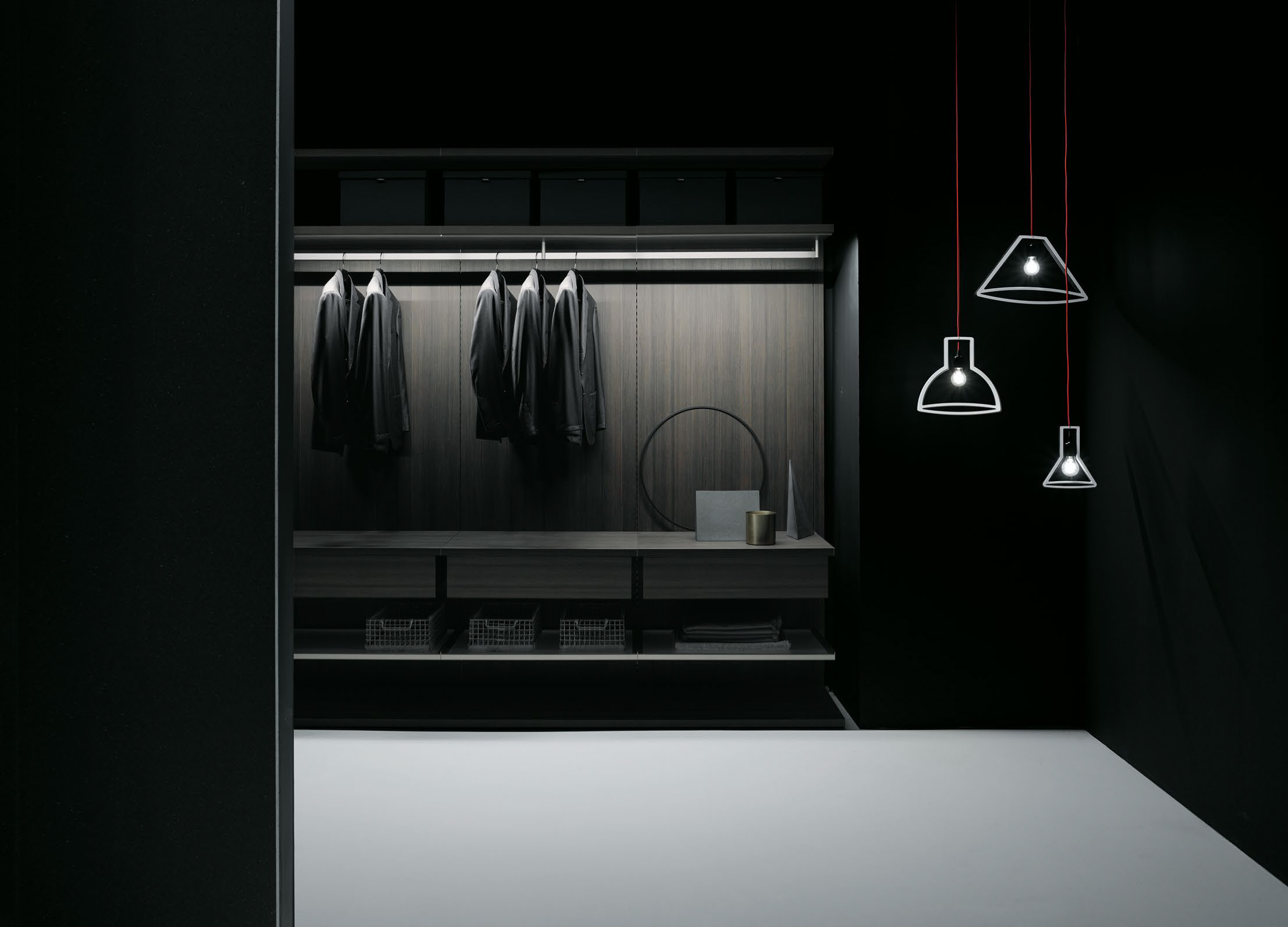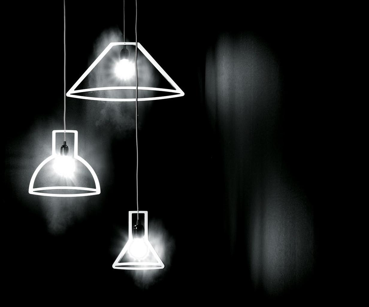 Suspended lamp made of black fibre board, with a white melamine resin coat and cables covered by red woven fabric.
