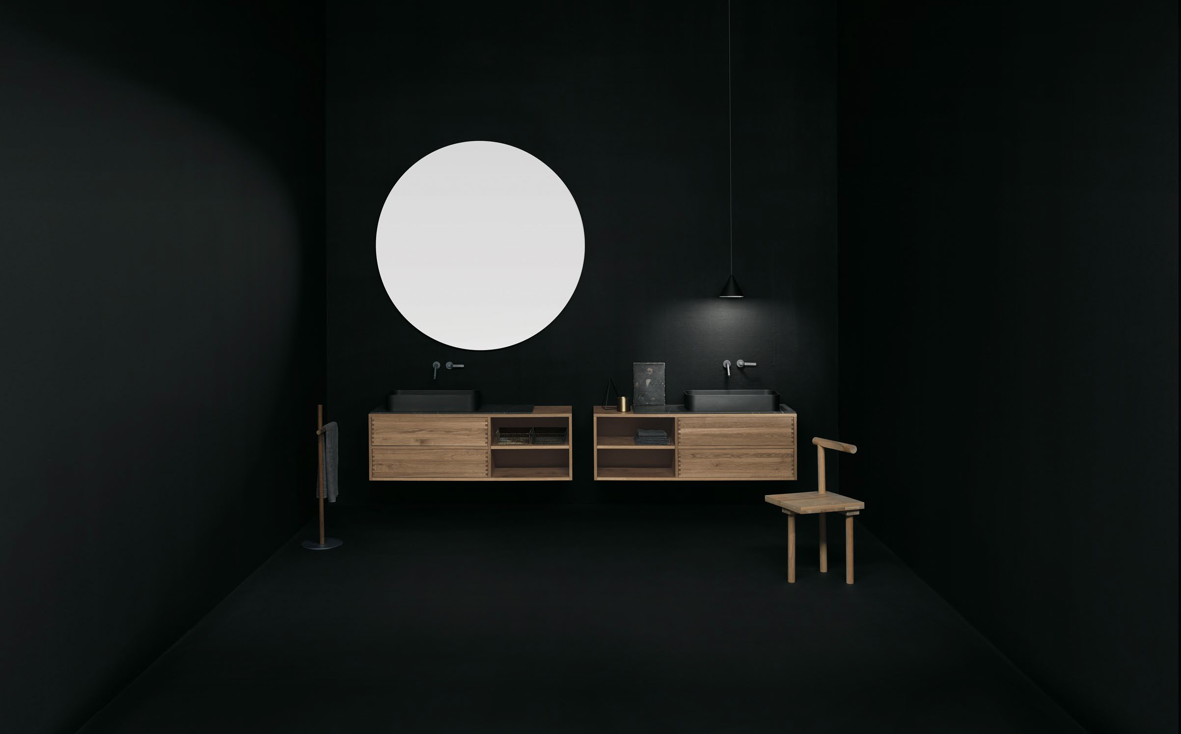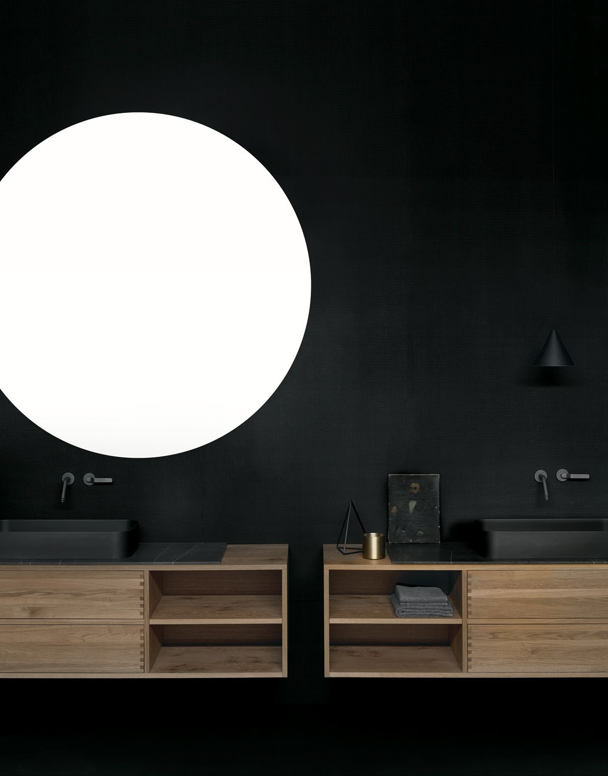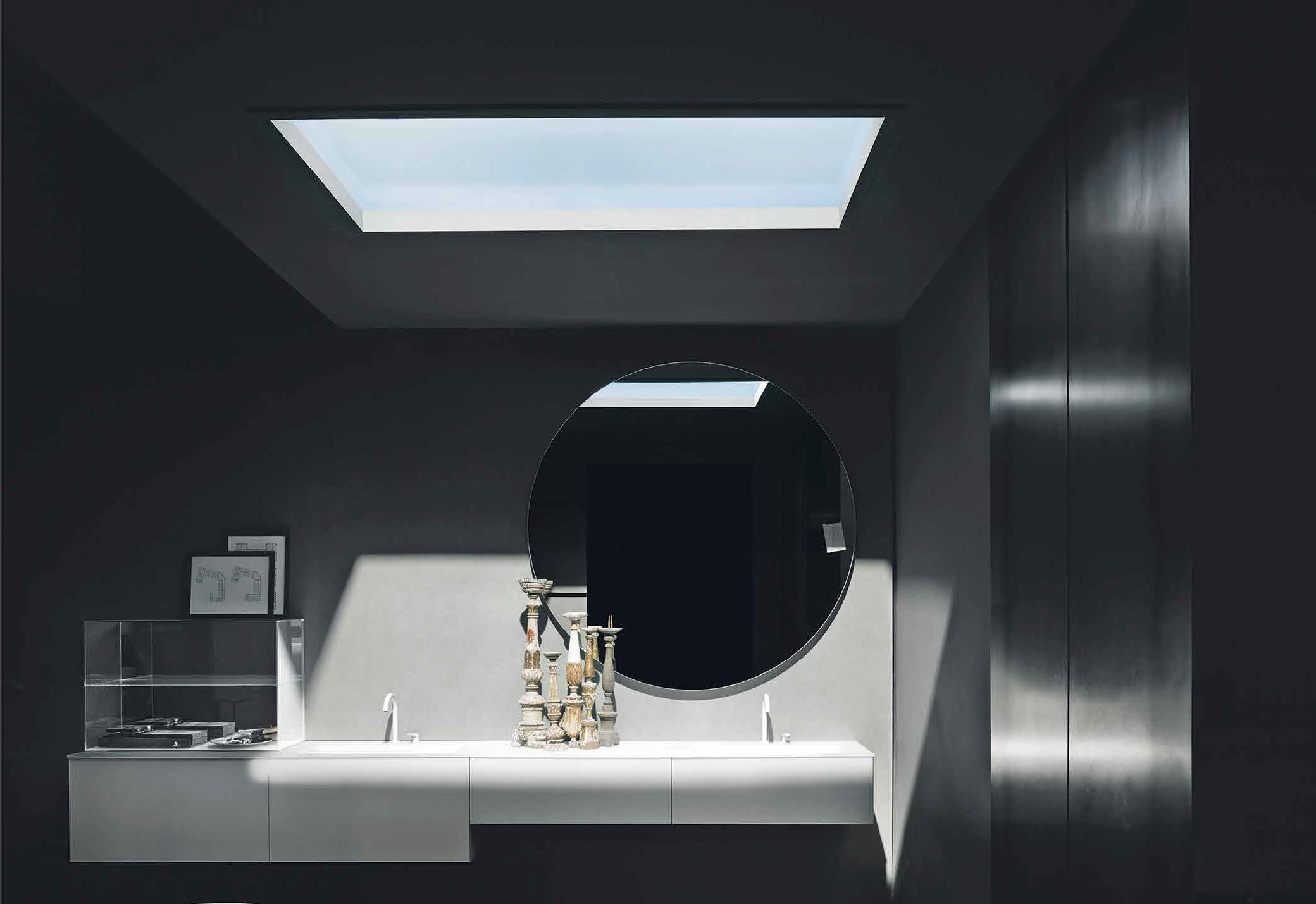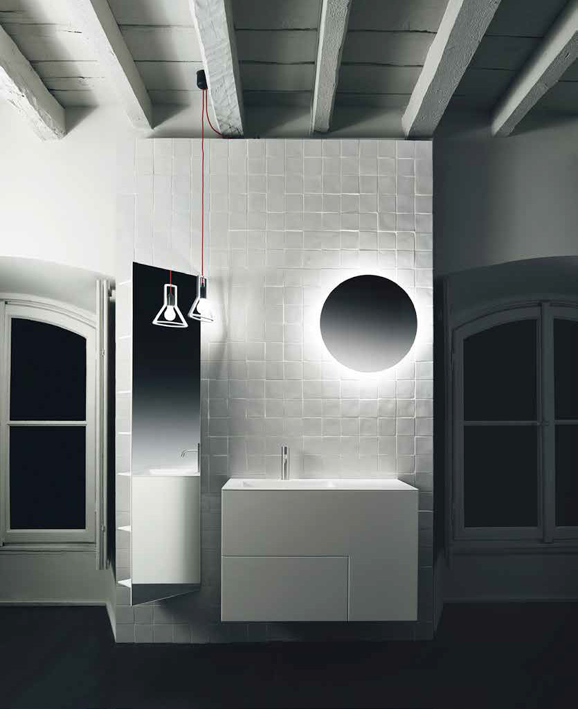 Runder, übergangsloser Spiegel mit rückseitiger Beleuchtung.