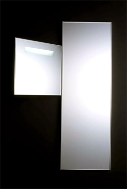 Mirror with aluminium frame, into the mirror integrated light and side-opening feature. Available with different measurements and as beautifully furnished mirrored cabinet.